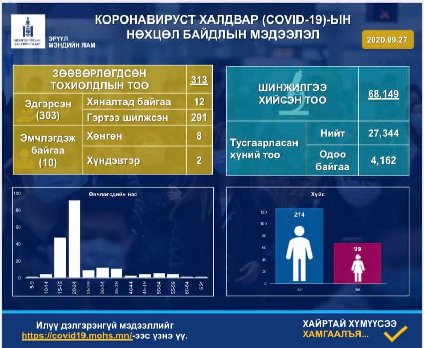 Өнөөдөр /2020.09.27/ ХӨСҮТ-ийн Вирус судлалын лаборатори, Дархан-Уул аймгийн вирус судлалын салбар лабораторид нийт 554 сорьцод шинжилгээ хийхэд коронавирус илрээгүй талаар ЭМЯ-наас мэдээллээ.