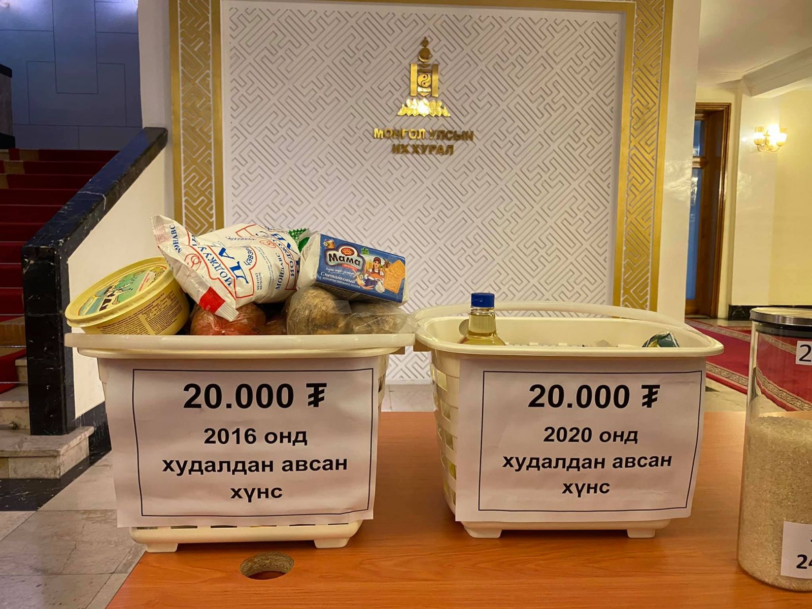 Түүнчлэн төгрөгийн ханшийн уналтыг өргөн хэрэглээний бараа, бүтээгдэхүүний үнээр илэрхийлсэн үзэсгэлэн гаргаж байна. Үүнээс харахад 2016 онд кг цагаан будаа 2400 төгрөг байжээ. Өнөөдөр ийм хэмжээний мөнгөөр ердөө 0.65 кг цагаан будаа авч болохоор байна.
