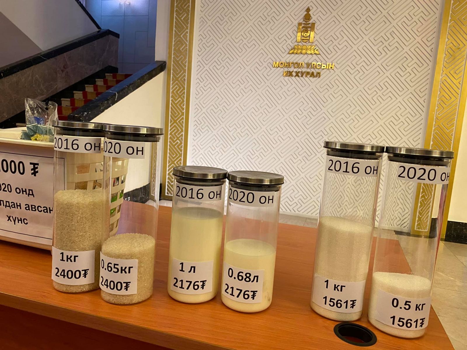 Мөн онд нэг л сүү 2176 төгрөг, одоо дээрх мөнгөөр 0.68 литр сүү худалдан авна. Элсэн чихэр 1561 төгрөг, 2020 онд 0.52 кг элсэн чихэр буюу талыг нь худалдан авахаар байгааг үзэсгэлэнгээр харуулжээ.