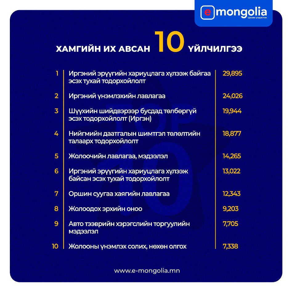 Тэгвэл аравдугаар сарын 1-нд олон нийтэд танилцуулагдсан E-Mongolia системээр дамжуулан төрийн үйлчилгээ авах иргэдийн тоо эрс өссөн байна. Тус системд төрийн 23 байгууллагын 181+ үйлчилгээ ороод байгаа бөгөөд ирэх 2021 онд 492 үйлчилгээ нэгтгэгдэнэ.
