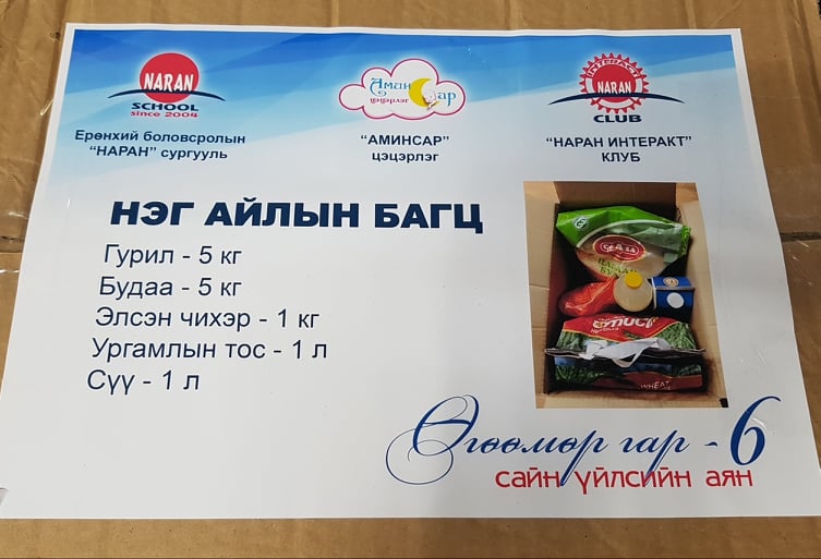 Баянгол дүүргийн 3-р хорооны нутаг дэвсгэрт байрлах Ерөнхий боловсролын НАРАН сургууль, АМИНСАР цэцэрлэгийн хамт олон коронавируст /ковид-19/ цар тахлын нөхцөл байдалтай холбогдуулан хүнс тэжээлийн хомсдолд орж болзошгүй, зорилтот бүлгийн иргэдэд туслах “Өгөөмөр гар-6” сайн үйлсийн аян өрнүүлжээ.
