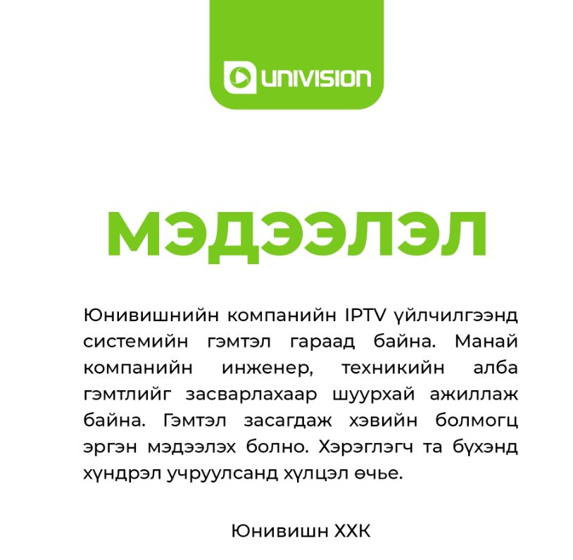 Учир нь Юнивишн компанийн IPTV үйлчилгээнд системийн гэмтэл гарчээ.
