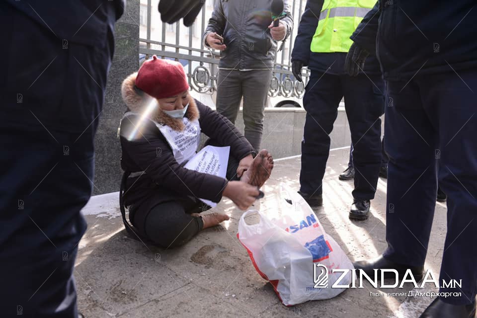 Гадаа -13 хэмийн хүйтэн байгаа тул хөл нүцгэн хүйтэн зам дээр алхана гэдэг бэрх. Дээр нь коронавирусний тархалт өндөр байгаа тул халдвар авахыг ч үгүйсгэхгүй. Тиймээс цагдаа нар түүнд шаардлага тавьсны дагуу гутлаа өмсөж, өргөдлөө шуудангийн ажилтанд хүлээлгэн өглөө.