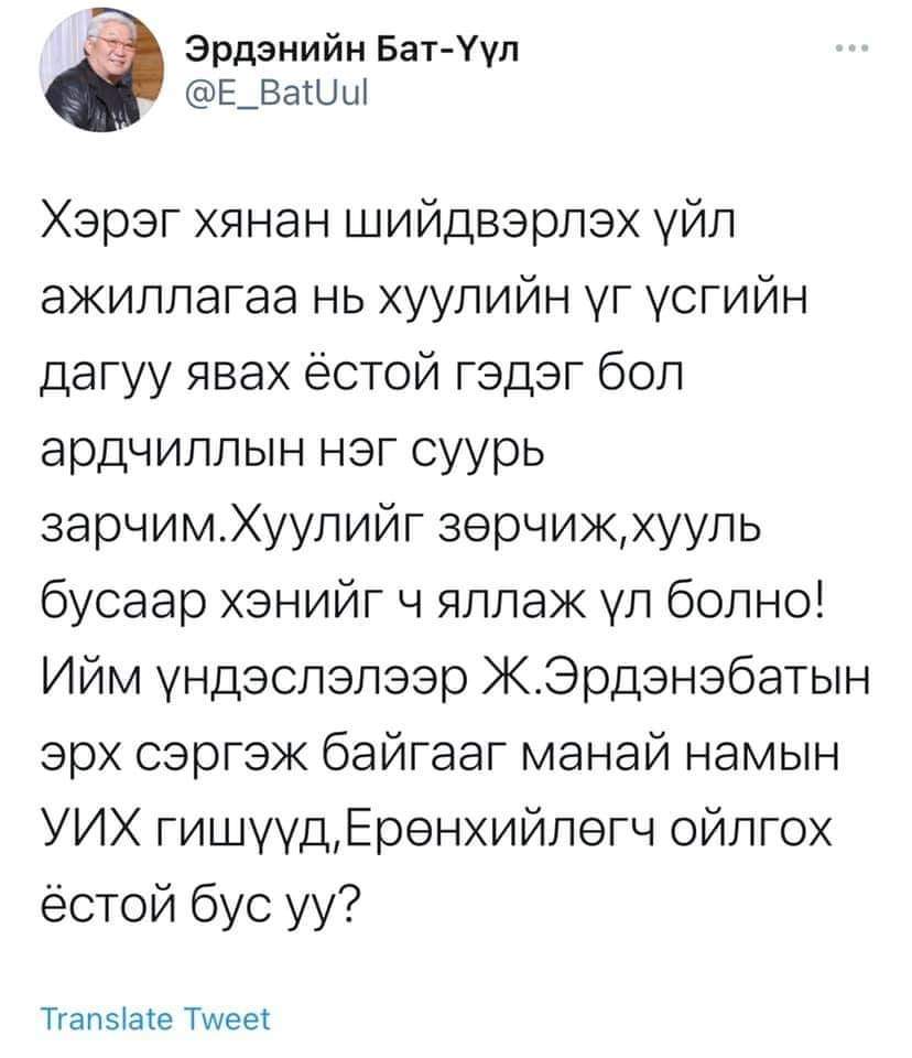 Бат үүл зөв хэлж бн.Энэ Баасан мэтийн хүмүүс яагаад юм ойлгодоггүй юм бэ.Энэ Эрдэнэбатыг УИХ ын гишүүн бхд нь хууль зөрчиж хонгилын шүүгчид барьж хорьслн.1.2 ршатны шүүх нь хууль бус болсон гээд.дээд шүүх нь хэрэгсэхгүй болгосон бхад эрхийг нь сэргээхэд яагаад болдоггүй юм.Аод түмний сонголт шүү дээ.Баасан авгай Дээд шүүхийн дээр суух гээп бгаамуу.Тэнэг гэдэг нь.