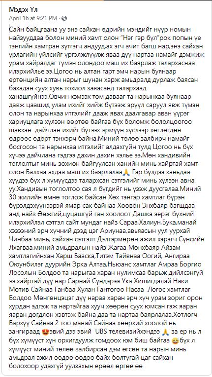 Түүний хувьд саяхан элэг солиулах хагалгаанд орсон бөгөөд хэдхэн хоногийн өмнө "Миний хамт олон “Нэг гэр бүл” рок, попын үе тэнгийн хамтран зүтгэгч андууд, ах эгч, ачит багш нар, энэ сайхан урлагийн үйлсийг үргэлжлүүлж яваа дүү нартаа намайг дэмжиж, урам хайрладаг түмэн олондоо маш их баярлаж, талархаснаа илэрхийлье ээ. Цогоо нь алтан гарт эмч нарын буянаар ертөнцийн алтан нарыг шунан харж, амьдралд дурлаж, баясан бахдан суух хувь тохиол заяасанд талархаад ханашгүй нь ээ. Өвчин хэмээх том давааг та нарынхаа буянаар давж, цаашид улам ихийг хийж бүтээж, эрүүл саруул явж, түмэн олон та нарынхаа итгэлийг даах даалгавар аван, үүрэг хариуцлага хүлээн, өөртөө байгаа бүх боломж бололцоогоо шавхан дайчлан, ихийг бүтээх хүслээр хөглөгдөн, өдрөөс өдөрт тэнхэрч байна. Миний төлөө залбирч, намайг босгосон та нарынхаа итгэлийг алдахгүйн тулд Цогоо нь бүх хүчээ дайчилна гэдгээ дахин дахин хэлье" хэмээн фэйсбүүк хуудаснаа бичиж байсан юм.