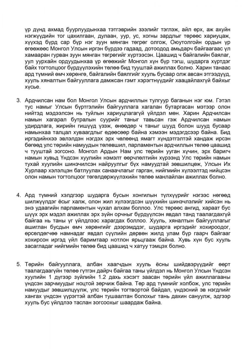 - Төрийн байгууллага, албан хаагчдын хууль ёсны шийдвэрүүдийг өөрт таалагдаагүйн төлөө гүтгэн дайрч байгаа таны үйлдэл нь Монгол Улсын Үндсэн хуулийн 1 дүгээр зүйлийн 1.2 дахь хэсэгт заасан төрийн үйл ажиллагааны үндсэн зарчмуудыг ноцтой зөрчиж байна. Төр ард түмнийг холбож, улс төрийн намуудыг зөвшилцүүлж, улс төрийн тогтвортой байдал, үндэсний эв нэгдлийг хангах үндсэн үүрэгтэй албан тушаалтан болохыг тань дахин сануулж, эдгээр хууль бус үйлдлээ таслан зогсоохыг шаардаж байна.