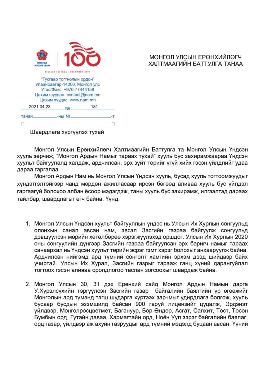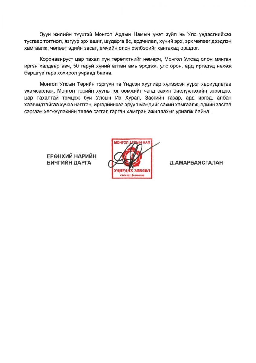 Коронавируст цар тахал хүн төрөлхтнийг нөмөрч, Монгол Улсад олон мянган иргэн халдвар авч, 50 гаруй хүний алтан амь эрсдэж, улс орон, ард иргэдэд нөхөж баршгүй гарз хохирол учраад байна. Монгол Улсын Төрийн тэргүүн та Үндсэн хуулиар хүлээсэн үүрэг хариуцлагаа ухамсарлаж, Монгол төрийн хууль тогтоомжийг чанд сахин биелүүлэхийн зэрэгцээ, цар тахалтай тэмцэж буй Улсын Их Хурал, Засгийн газар, ард иргэд, албан хаагчидтайгаа хүчээ нэгтгэн, иргэдийнхээ эрүүл мэндийг сахин хамгаалж, эдийн засгаа сэргээн хөгжүүлэхийн төлөө сэтгэл гарган хамтран ажиллахыг уриалж байна.