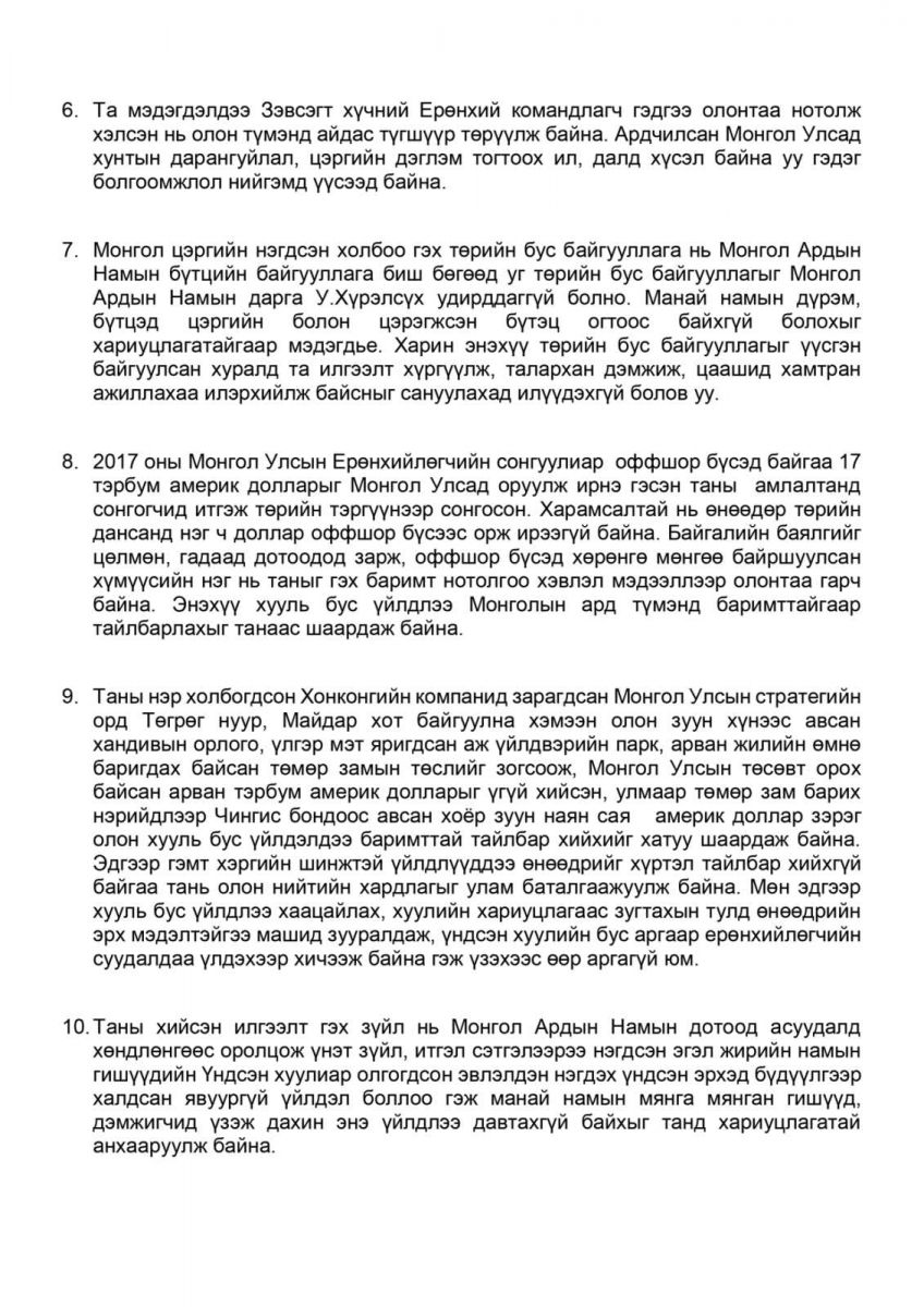 - Таны нэр холбогдсон Хонконгийн компанид зарагдсан Монгол Улсын стратегийн орд Төгрөг нуур, Майдар хот байгуулна хэмээн олон зуун хүнээс авсан хандивын орлого, үлгэр мэт яригдсан аж үйлдвэрийн парк, арван жилийн өмнө баригдах байсан төмөр замын төслийг зогсоож, Монгол Улсын төсөвт орох байсан арван тэрбум америк долларыг үгүй хийсэн, улмаар төмөр зам барих нэрийдлээр Чингис бондоос авсан хоёр зуун наян сая америк доллар зэрэг олон хууль бус үйлдэлдээ баримттай тайлбар хийхийг хатуу шаардаж байна. Эдгээргэмт хэргийн шинжтэй үйлдлүүддээ өнөөдрийг хүртэл тайлбар хийхгүй байгаа тань олон нийтийн хардлагыг улам баталгаажуулж байна. Мөн эдгээр хууль бус үйлдлээ хаацайлах, хуулийн хариуцлагаас зугтахын тулд өнөөдрийн эрх мэдэлтэйгээ машид зууралдаж, үндсэн хуулийн бус аргаар ерөнхийлөгчийн суудалдаа үлдэхээр хичээж байна гэж үзэхээс өөр аргагүй юм.
