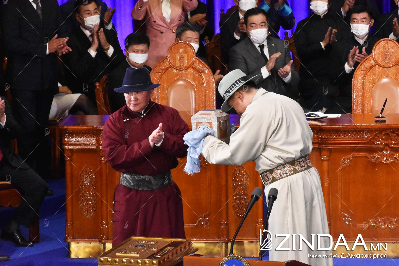 Ерөнхийлөгч У.Хүрэлсүх "Монгол Улсын тусгаар тогтнол, бүрэн эрхт байдал, Монголын ард түмний эрх чөлөөг эрхэмлэн хамгаалж, Үндсэн хуулийг дээдлэн сахиж Монгол Улсын Ерөнхйилөгчийн үүргийг шударгаар гүйцэтгэхээ батлан тангараглая" хэмээн тангараг өргөж, өмнөх Ерөнхийлөгч Х.Баттулга тамгаа шилжүүлснээр У.Хүрэлсүх Монгол Улсын Ерөнхийлөгч боллоо.