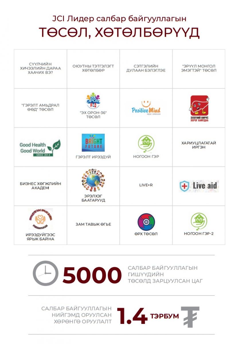 JCI Лидер салбар байгууллагын хэрэгжүүлдэг Positive Mind, Live+R, Хайртай хүмүүсээ хамгаалъя төслүүд хэднийнэ олны танил болжээ. 15 жилийн хугацаанд тус салбар байгууллага нийт 20 орчим төсөл хөтөлбөрийг хэрэгжүүлж 1.4 тэрбум төгрөгийн хөрөнгө оруулалтыг нийгэмд хийсэн байна.