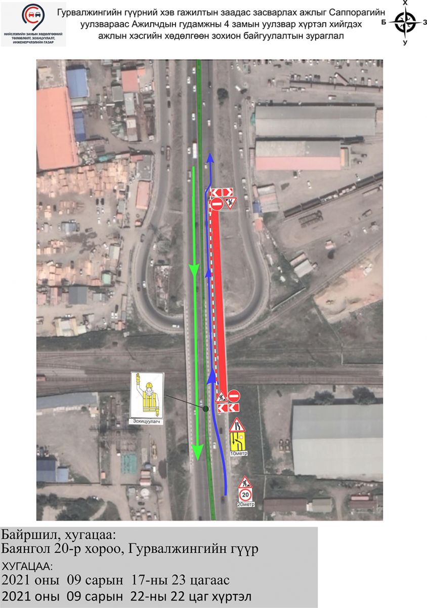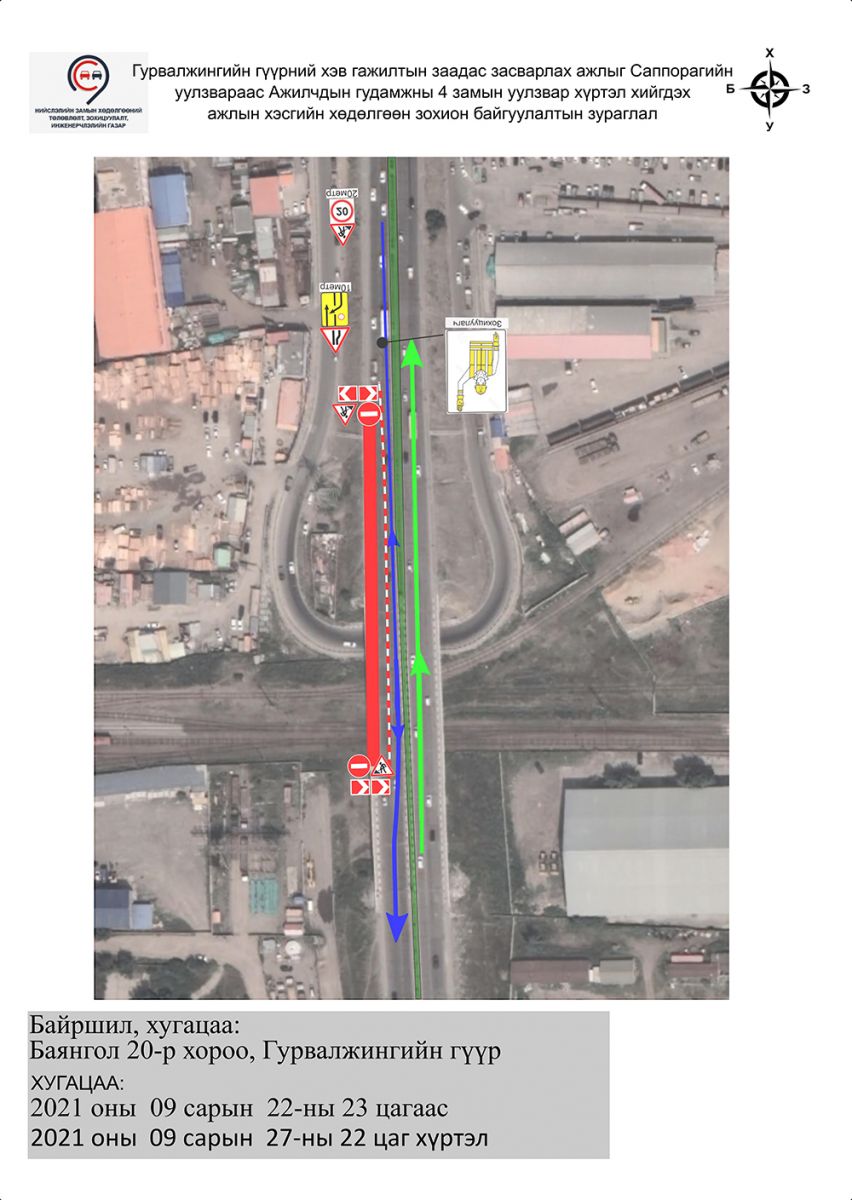 Харин Саппорагийн уулзвараас Ажилчдын гудамжны дөрвөн замын уулзвар хүртэл буюу хойноос урагш чиглэсэн зорчих хэсгийн нэгдүгээр эгнээний хөдөлгөөнийг есдүгээр сарын 22-ны 23:00 цагаас есдүгээр сарын 24-ний 22:00 цагийн хооронд хязгаарлана. Түүнчлэн хоёрдугаар эгнээний хөдөлгөөнийг есдүгээр сарын 24-ний 23:00 цагаас есдүгээр сарын 27-ны 22:00 цагийн хооронд хааж, засварын ажил хийж, хөдөлгөөн зохион байгуулалтад өөрчлөлт орно.