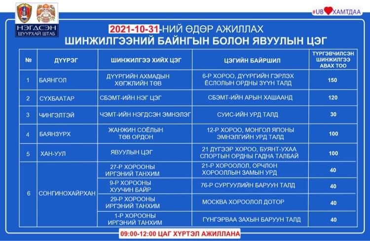 2021.10.31-нд ажиллах шинжилгээний байнгын болон явуулын цэг
