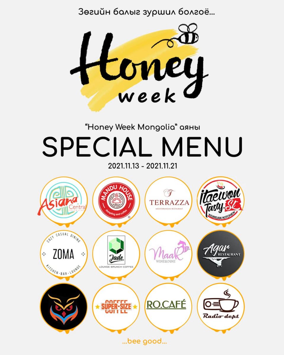 "Honey week" аяны хүрээнд энэ сарын 13-21-ны өдрүүдэд өндөр зэрэглэлийн, томоохон 14 ресторан, кофе шопуудаар зөгийн балны найрлагатай тусгай цэсээр үйлчилж байгаа билээ. Тэгвэл долоо хоногийн хугацаанд борлуулагдах зөгийн балны найрлагатай шинэхэн бүтээгдэхүүнийг танилцуулж байна.