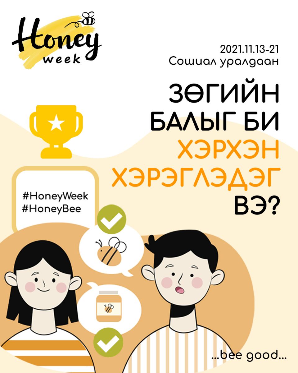 Зөгийн балны ач холбогдол, олон талт хэрэглээг таниулах, нөгөө талдаа зөгийн балны үйлдвэрлэлийн чанарыг сайжруулах энэхүү төслийн нэг хэсэг болгож өнөөдрөөс буюу энэ сарын 13-21-ны өдрүүдэд “Honey Week” зөгийн балны долоо хоногийн аян зохион байгуулж буй. Аяны хүрээнд "Би зөгийн балыг хэрхэн ашигладаг вэ?" гэх зөгийн балыг хэрхэн сонирхолтойгоор ашигласан жороо хуваалцах сошиал уралдааныг зарлалаа.