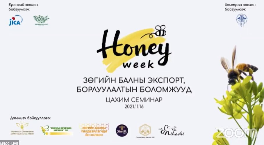 “Honey week” долоо хоногийн аяны хүрээнд арван нэгдүгээр сарын 16-нд зөгийн балны үйлдвэрлэлийн чанарыг сайжруулах, борлуулах талаар сургалт, хэлэлцүүлэг боллоо. “Зөгийн балны экспорт, борлуулалтын боломжууд” цахим семинарт салбар, салбарын төлөөллүүд санал бодлоо солилцож, зөгийн балны үйлдвэрлэлд тавигдах стандарт шаардлагыг танилцууллаа.