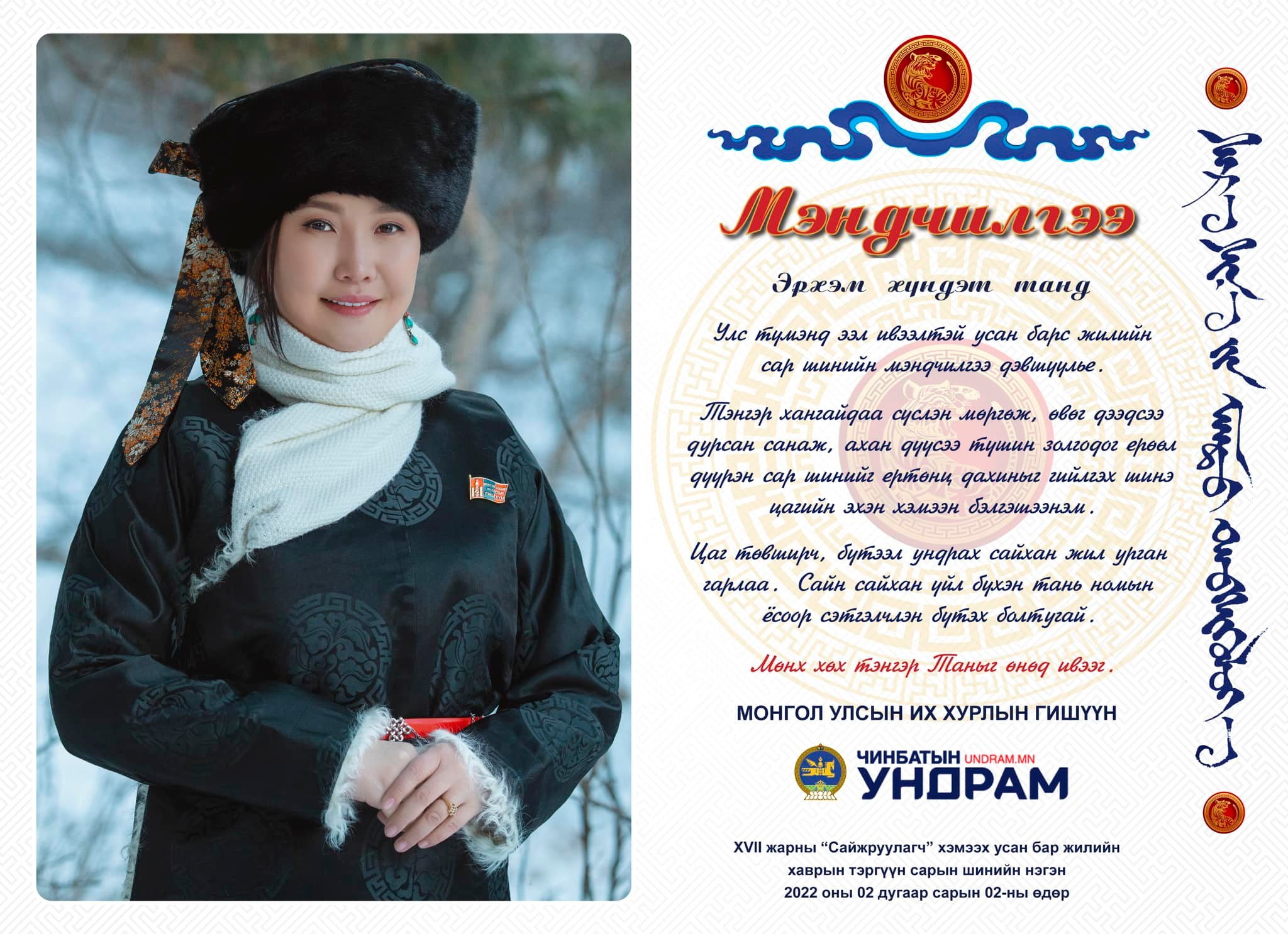 Өлзий гэгээн ард түмний минь өнө эртнээс уламжлан дээдэлж ирсэн цагаан сар бол үндэстний их баяр баясгалан, өрнөн дэлгэрэх ирээдүйг бадраадаг ариун сэтгэлийн өргөн ёслол юм. Тэнгэр хангайдаа сүслэн мөргөж, өвөг дээдсээ дурсан санаж, ахан дүүсээ түшин золгодог ерөөл дүүрэн сар шинийг ертөнц дахиныг гийлгэх шинэ цагийн эхэн хэмээн бэлгэшээнэм.