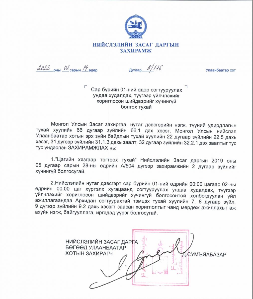 Нийслэлийн засаг даргын өчигдөр (2022.02.14) гаргасан захирамжаар сар бүрийн 1-нд архи, согтууруулах ундаа худалдах, түүгээр үйлчлэхийг хориглосон шийдвэрийг хүчингүй болгожээ.