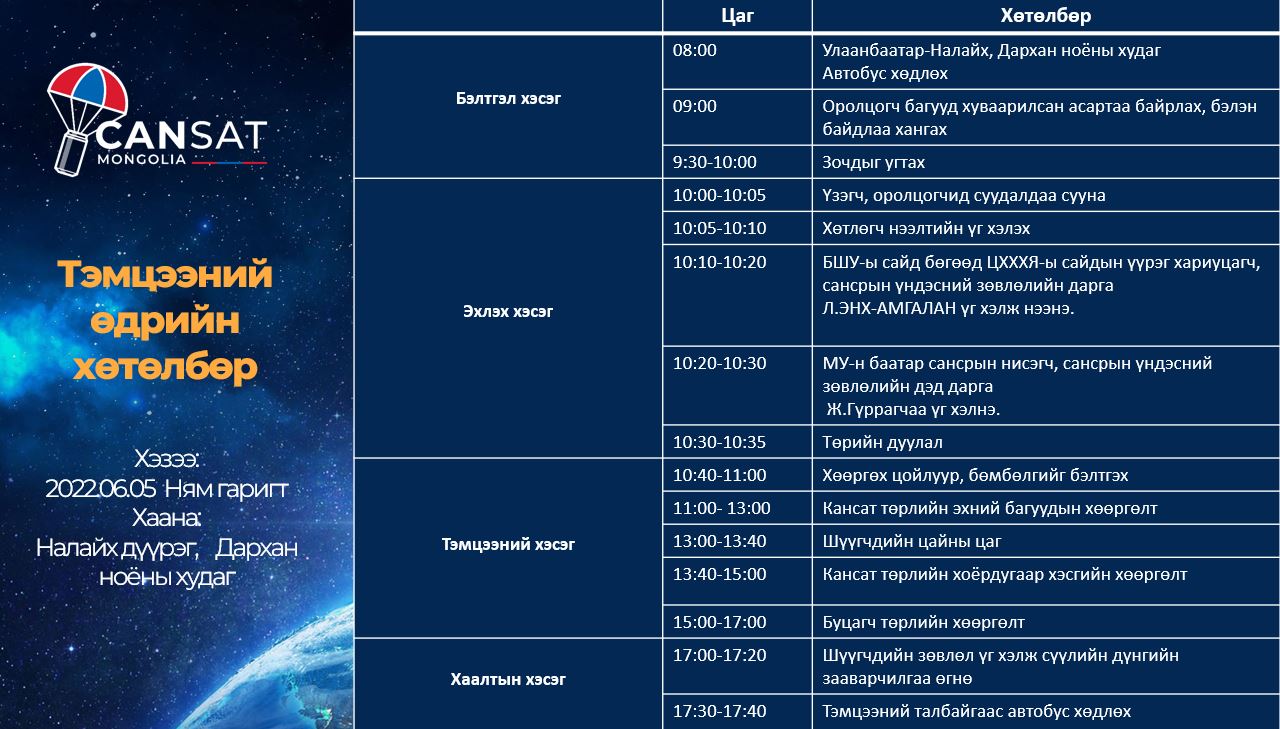 Тус тэмцээнд МУИС, ШУТИС, ХААИС, ҮБХИС, Шинэ Монгол, Монгол Коосен зэрэг найман их, дээд сургуулийн 15 багийн 90 гаруй оюутан, залуус оролцож, өөрсдийн бүтээсэн сансрын бага оврын хиймэл дагуулыг хөөргөж, өрсөлдөх юм.