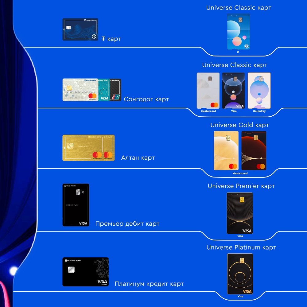 Голомт банкны хамт олон 30 жилийнхээ ойг тохиолдуулан картын загвараа бүрэн шинэчилж, хил хязгааргүй орон зай, цаг хугацааг илэрхийлэх Universe шинэ картуудаа танилцуулж байна. Universe загварын картууд нь санхүүгийн ертөнцийг таны гарт атгуулж, огторгуйн өргөн уудамд эргэлдэгч дагуул адил дэлхийн хаана ч таны санхүүгийн аяллын хөтөч болж, хил хязгааргүй боломж, дахин давтагдашгүй үнэ цэн, нэр хүндийн баталгааг өгөх болно.