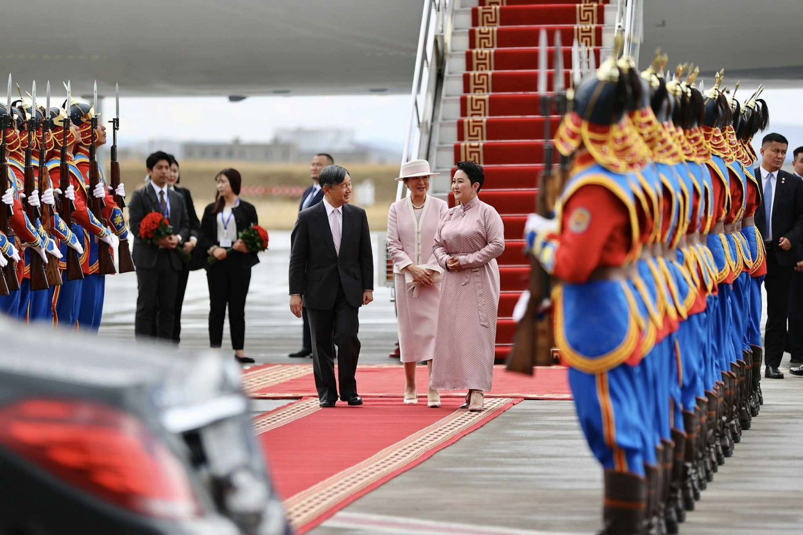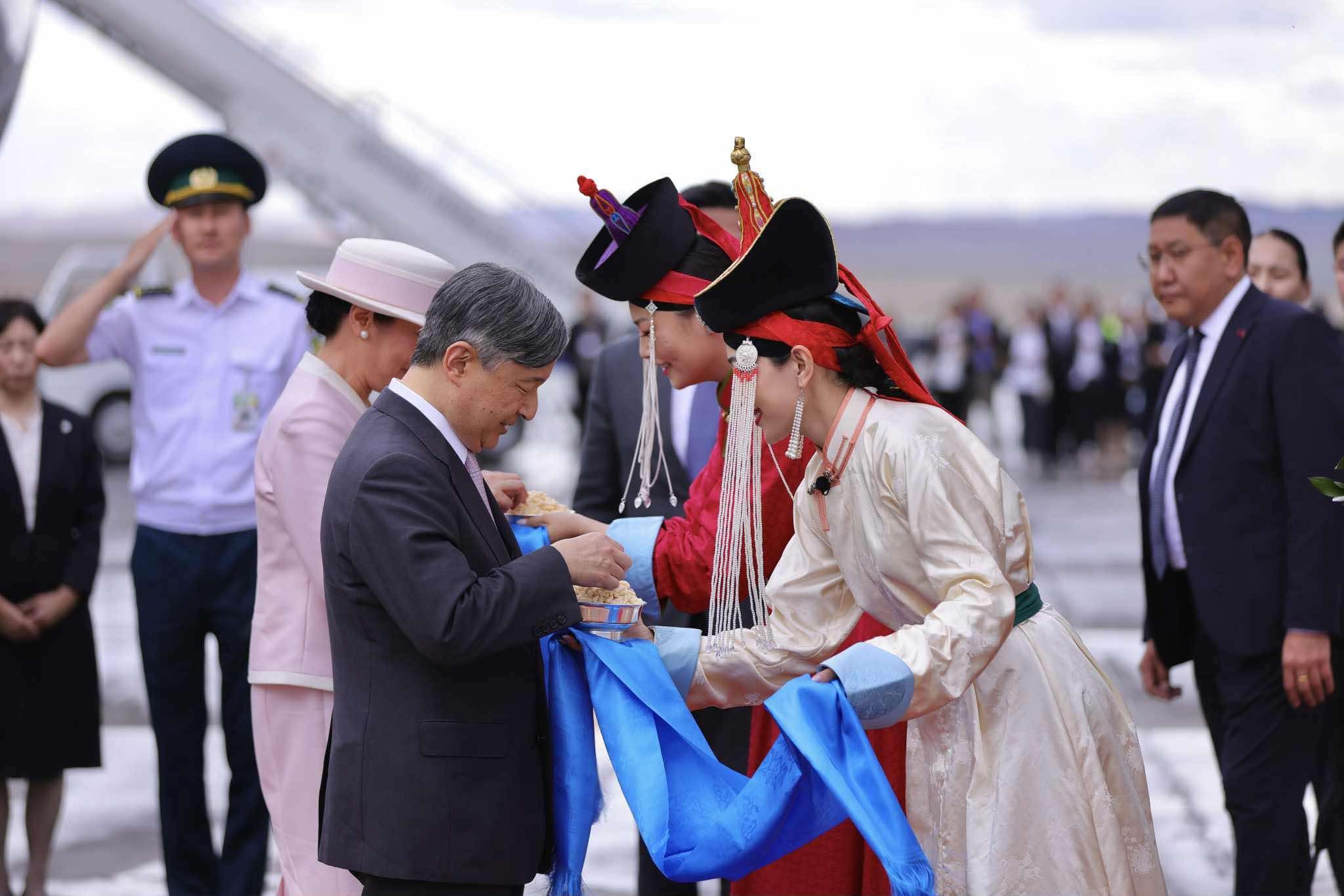 Цог Жавхлант Эзэн Хаан Нарүхито, Эрхэм дээд Хатан Масако нарыг “Чингис хаан” олон улсын нисэх буудалд Гадаад харилцааны сайд Б.Батцэцэг, Монгол Улсаас Япон Улсад суугаа Онц бөгөөд Бүрэн эрхт Элчин сайд Б.Баярсайхан, Япон Улсаас Монгол Улсад суугаа Онц бөгөөд Бүрэн эрхт Элчин сайд М.Игавахара нарын төлөөлөгчид угтлаа.