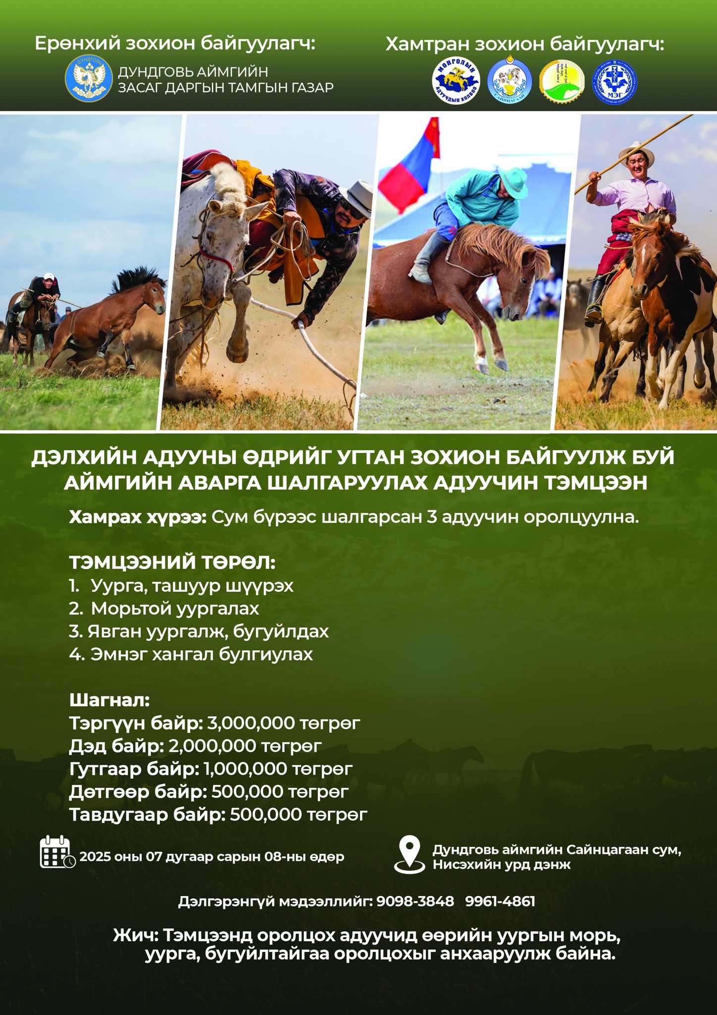 Хамтран зохион байгуулагч: Монголын Адуучдын Холбоо Дундговь аймгийн Хүнс, хөдөө аж ахуйн газар Ду Мэг Сайнцагаан сумын Засаг Даргын Тамгын Газар