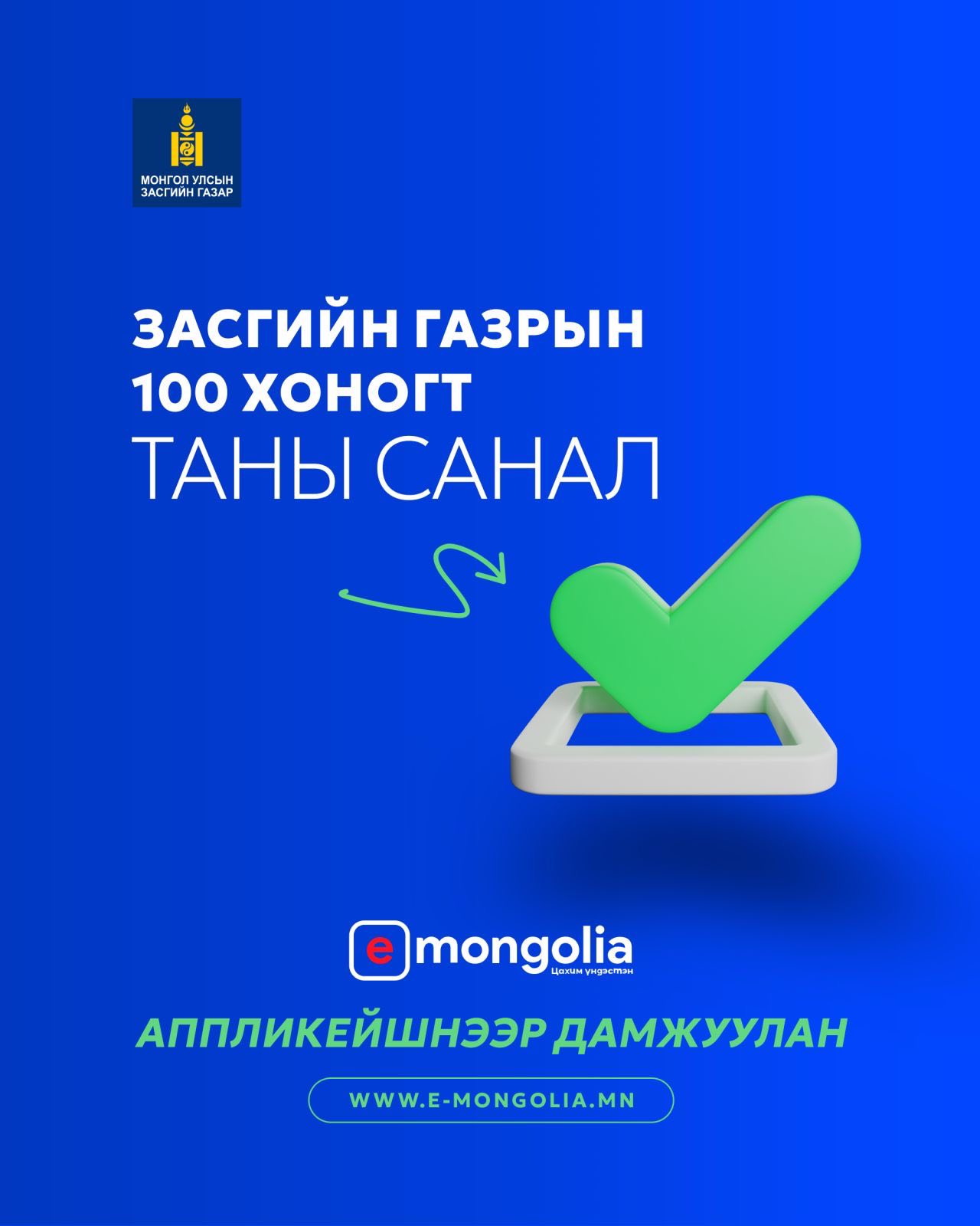 EMongolia системд нэвтэрсэн даруйд санал авах тусгай цонх нээгдэж, иргэн таны саналыг хүлээн авч байна. Мөн иргэд, олон нийтэд үйлчлэх 11-11 төв 24 цагийн турш утсаар, вэб хуудас, фэйсбүүк чатаар иргэдийн саналыг хүлээн авах юм. Засгийн газрын 100 хоногт багтаан хэрэгжүүлэх ажилд иргэд та бүхэн саналаа идэвхтэй өгөхийг уриалж байна.