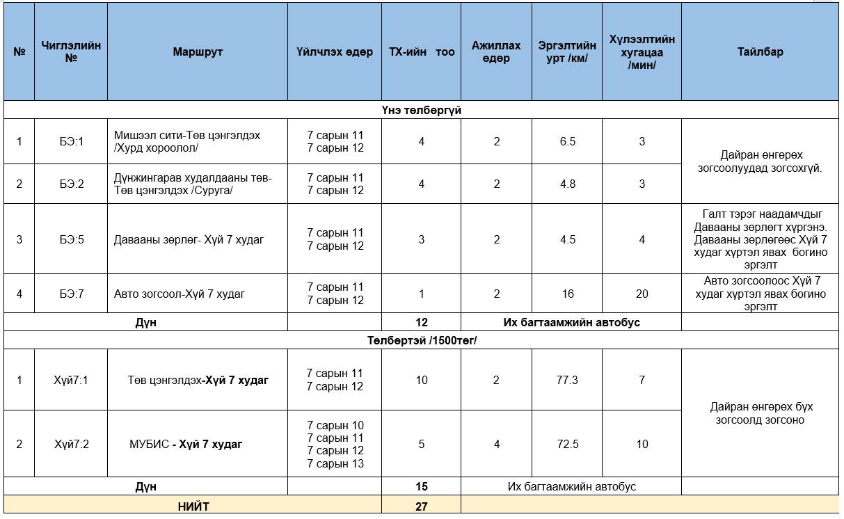 Тулгар төрийн 2234, Их Монгол Улсын 819, Үндэсний эрх чөлөө тусгаар тогтнолоо сэргээн мандуулсны 114, Ардын хувьсгалын 104 жилийн ой, Үндэсний их баяр наадмын өдрүүдээр нийт 139 чиглэлд 975 тээврийн хэрэгсэл үйлчилгээнд ажиллана.