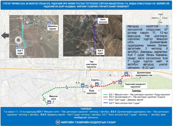 Иргэдэд нээлттэй гурван зогсоол буюу Мишээл сити, Дүнжингарав худалдааны төв, Үндэсний цэцэрлэгт хүрээлэнгийн авто зогсоолтой уялдуулан долоодугаар сарын 11, 12-ны өдөр Төв цэнгэлдэх хүрээлэн хүртэл Мишээл сити, Дүнжингарав худалдааны төвөөс богино эргэлтийн хоёр чиглэлд 8 автобус, Давааны зөрлөгөөс Хүй 7 худаг /Морь барианы газар/, Авто зогсоолоос Хүй 7 худаг хүртэл нийт 4 автобус иргэдэд 08:00-22:00 цаг хүртэл үнэ төлбөргүй үйлчилнэ.