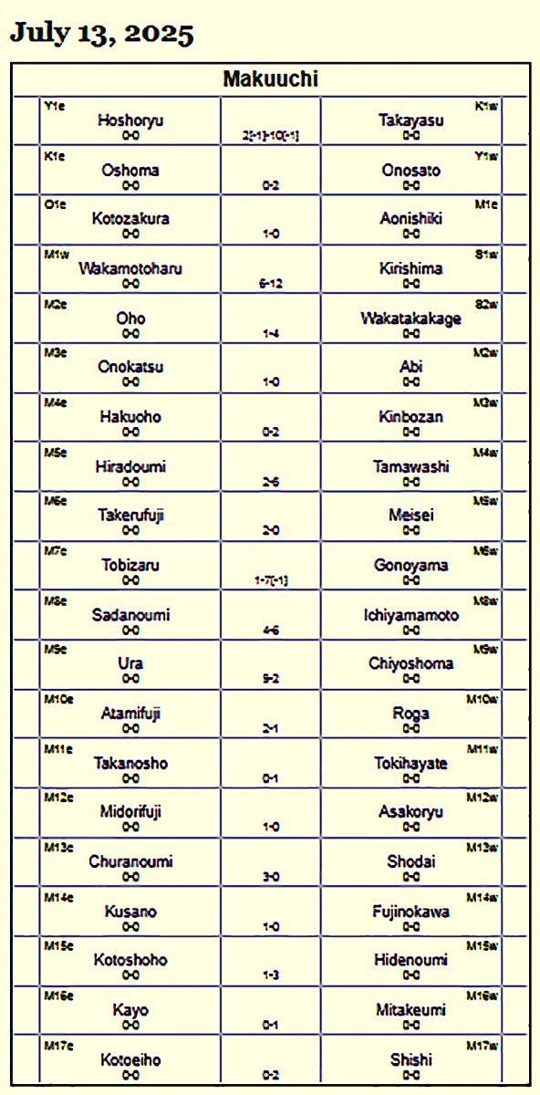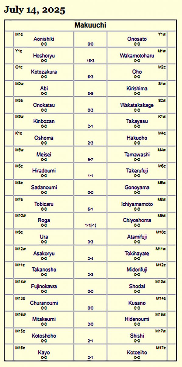 Нагоя башёгийн эхний хоёр өдрийн оноолт гарсан байна. Хоошёорюү С.Бямбасүрэн эхний өдөр комүсүби Такаясүтай, хоёр дахь өдөр Вакамотохарүтай таарчээ. Харин Ооносато эхний өдөр комүсүби Оошёома П.Дэлгэрбаяртай, хоёр өдөр Украины Аонишикитэй учраа таарсан байна. Японы хэвлэлүүдийн мэдээгээр бол Хоошёорюүтай эхний өдөр учраа таарсан Такаясү бэлтгэл дээр их сайн байгаа сурагтай.