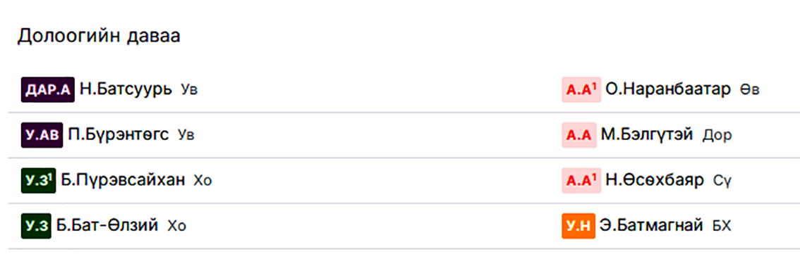 Ийнхүү долоогийн даваанд Дархан аварга Н.Батсуурь, Улсын аварга П.Бүрэнтөгс, Улсын заан Б.Пүрэвсайхан, Б.Бат-Өлзий, Улсын начин Э.Батмагнай, аймгийн хурц арслан О.Наранбаатар, Н.Өсөхбаяр, аймгийн арслан М.Бэлгүтэй нар шалгаран үлдээд байна.