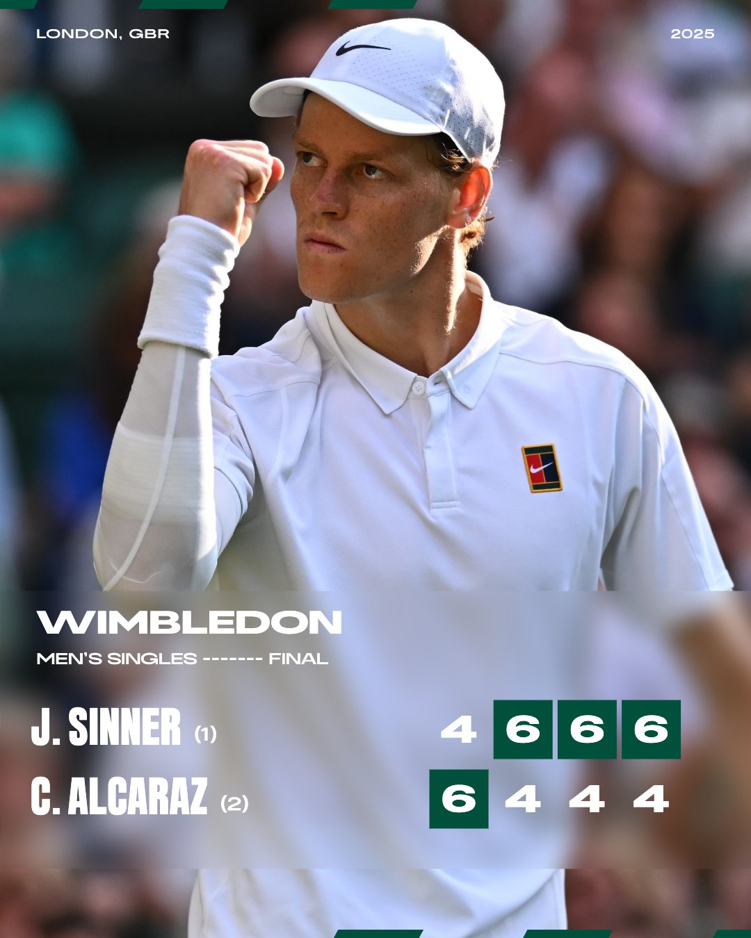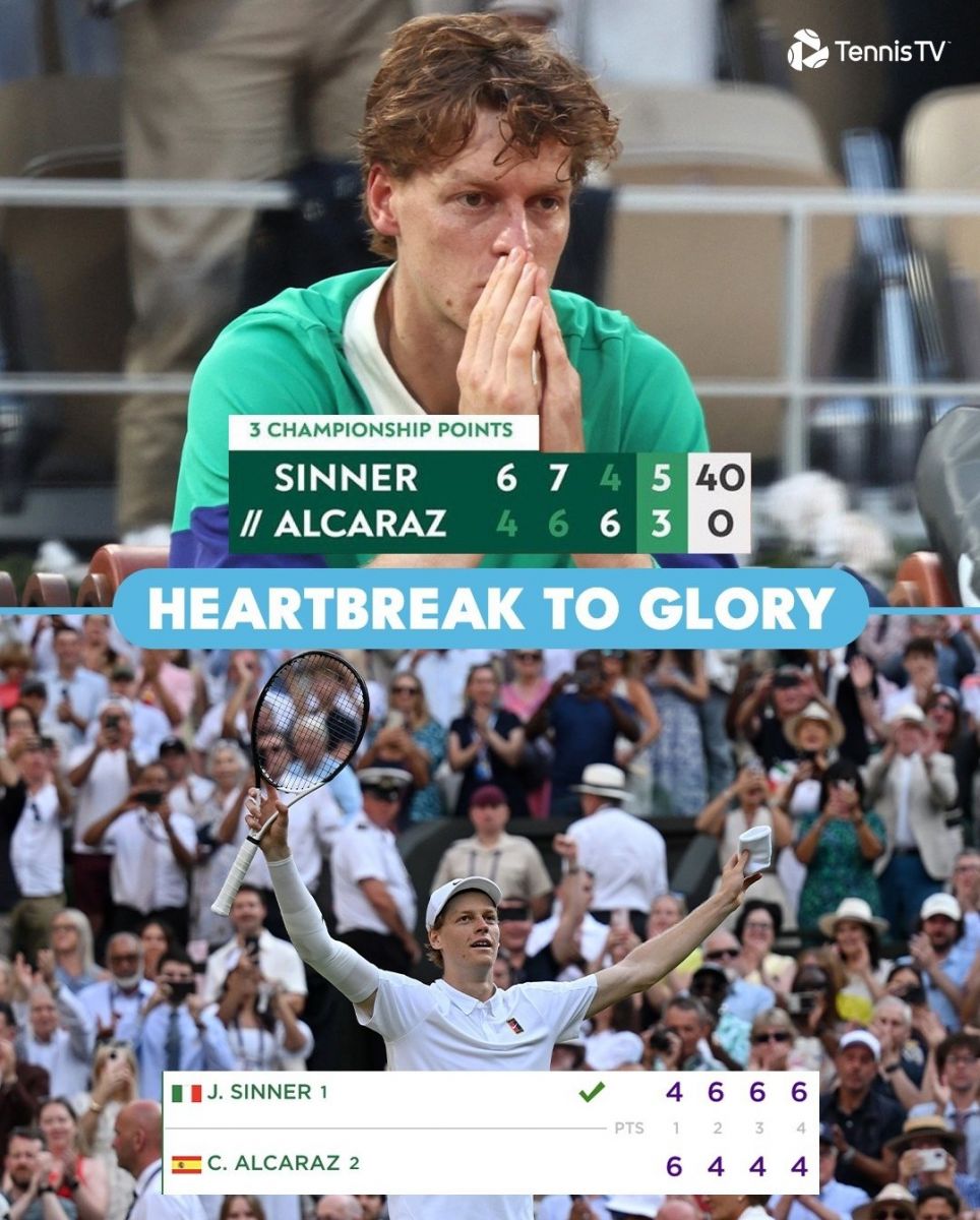 5 цаг 29 минутын турш үргэлжилсэн тийм хүнд тоглолтод хожигдсон тамирчин нэг жилдээ сэтгэл санаа сэргэхгүй байх гэж зарим мэргэжилтнүүд таамаглаж байж. Гэвч Синнер ердөө сар гаруйхны дараа Уимблдоны финалд өнөөх Алькарастай дахин тулж, эхний сетэд 4:6-аар ялагдсан ч дараа нь гурван сет дараалан 6:4-өөр илүүрхэж, Уимблдоны аваргаар анх удаагаа тодорлоо.