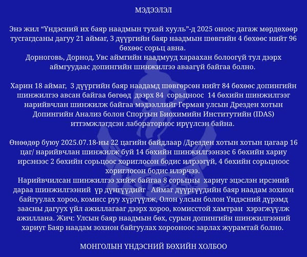 Гэхдээ энэ бол улсын их баяр наадмынх бус харин аймаг, дүүргийн наадмын допингийн сорьцоос илэрсэн гэдгийг эрхэм уншигч та анхааран болгооно биз ээ. Одоогоор улсын их баяр наадмын допингийн шинжилгээний хариуны талаар ямар нэгэн мэдээлэл цацагдаагүй байна.