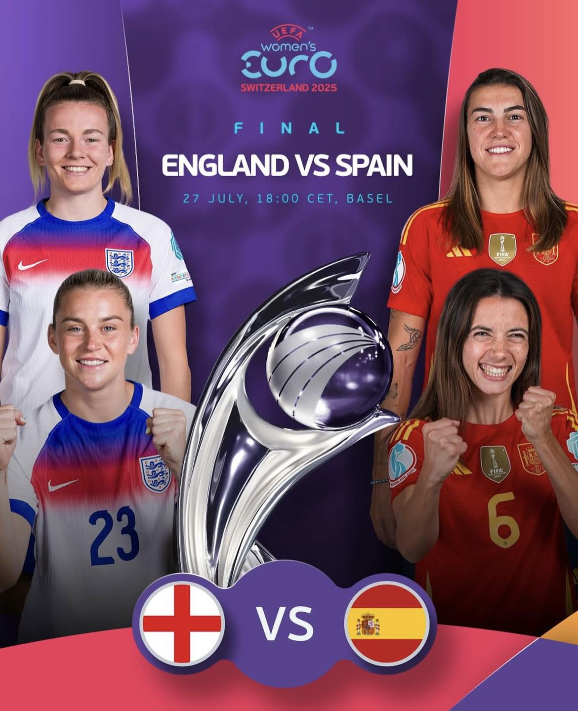 Долдугаар сарын 27-нд Базель хотын "St.Hakob-Park" хэмээх 38,000 хүний суудалтай цэнгэлдэхэд 2022 оны Европын аварга Англи, 2023 оны Дэлхийн аварга Испаний шигшээ багууд 2025 оны Европын аварга цол, цом, алтан медалийн төлөө өрсөлдөнө.