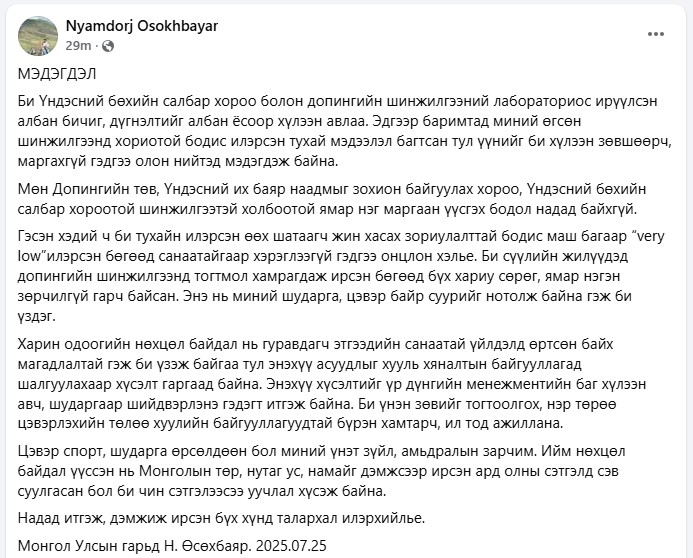 Би Үндэсний бөхийн салбар хороо болон допингийн шинжилгээний лабораториос ирүүлсэн албан бичиг, дүгнэлтийг албан ёсоор хүлээн авлаа. Эдгээр баримтад миний өгсөн шинжилгээнд хориотой бодис илэрсэн тухай мэдээлэл багтсан тул үүнийг би хүлээн зөвшөөрч, маргахгүй гэдгээ олон нийтэд мэдэгдэж байна.