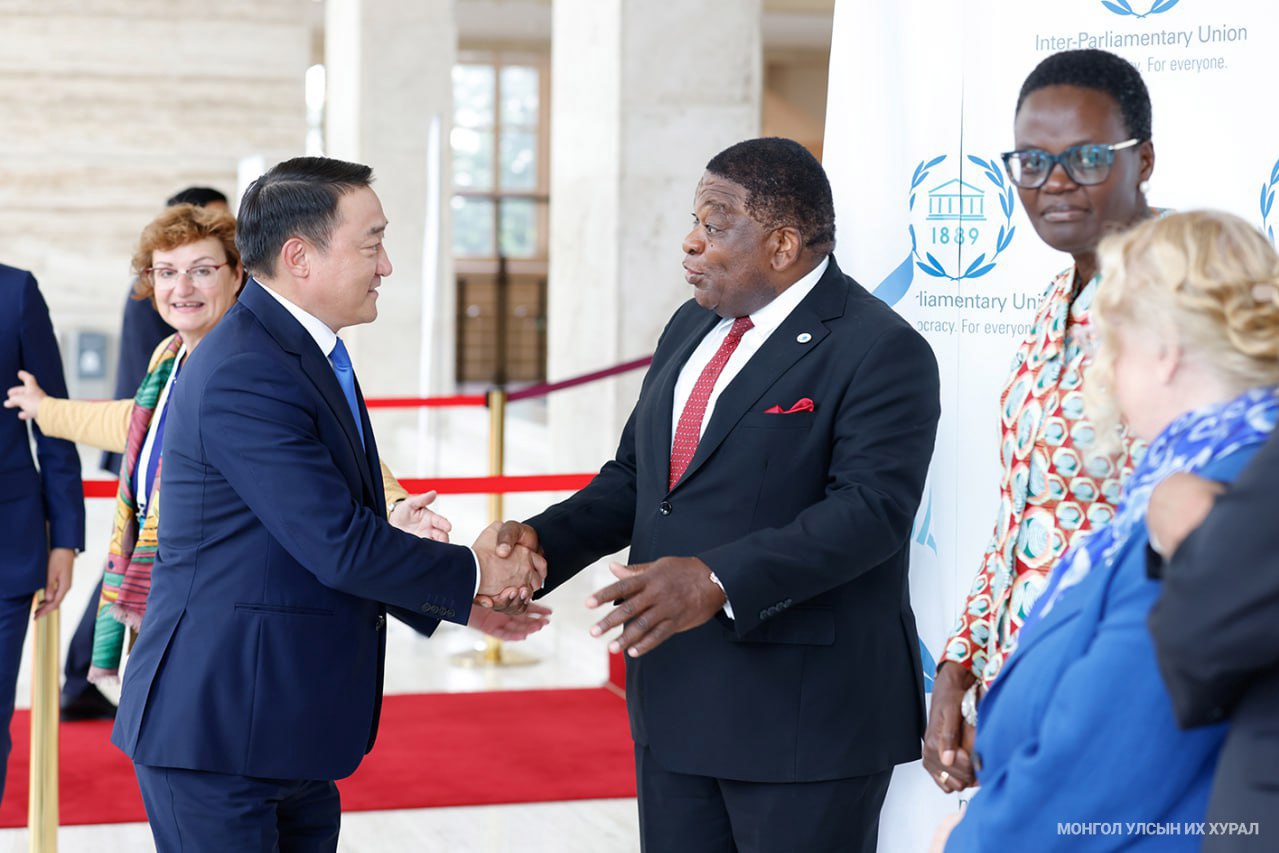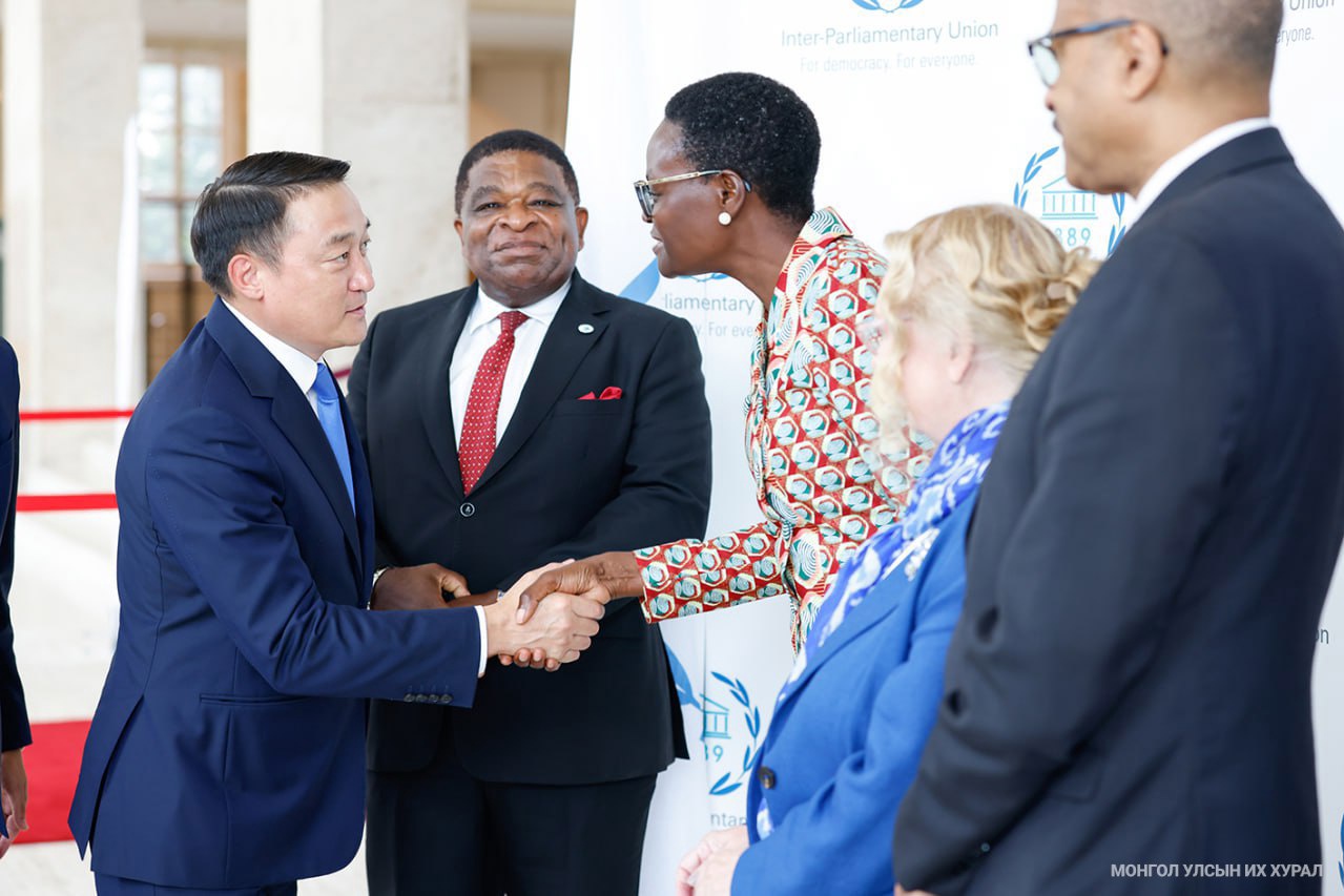 Монгол Улсын Их Хурлын дарга Д.Амарбаясгаланг ОУПХ-ны Ерөнхийлөгч Тулиа Аксон, Ерөнхий нарийн бичгийн дарга Мартин Чунгон, НҮБ-ын Женев дэх төвийн захирал Татьяна Валовая, НҮБ-ын Ажлын албаны дарга Өөрл К.Рэттрэй нар угтан, мэндчиллээ.