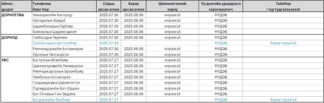 Монгол Улсын Үндэсний их баяр наадмын тухай хуульийн хүрээнд 2025 оны долоодугаар сарын 27-30-ны өдрүүдэд зохион байгуулсан Дорноговь, Дорнод, Увс аймгуудын байр наадмын үеэр үндэсний бөхийн барилдаанд амжилттай барилдаж, шөвгөрсөн бөхчүүдээс допингийн хяналтын сорьц авчээ.