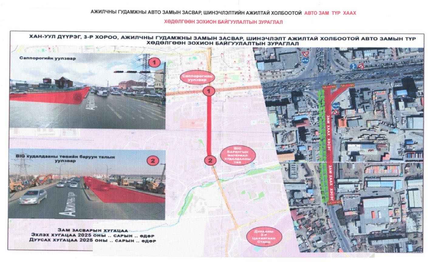 Ажилчны гудамжны авто замын засвар, шинэчлэлтийн хүрээнд “Биг” худалдааны төвийн уулвзараас Саппорогийн уулзвар хүртэлх авто замын зүүн эгнээг хэсэгчлэн хааж засвар, шинэчлэлт хийнэ.