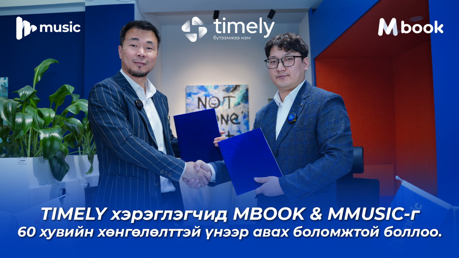 Дижитал шилжилтийн эрин үед технологийн стартапууд харилцан бие биенээ дэмжин хамтран ажилласнаар хэрэглэгчдэдээ илүү үнэ цэнтэй бүтээгдэхүүн, үйлчилгээ хүргэж чаддаг. Timely.mn компанийн гүйцэтгэх захирал Н.Болорхүү, Mbook болон Mmusic компанийн гүйцэтгэх захирал Д.Батмагнай нар хамтын ажиллагааны гэрээг үзэглэж харилцагч байгууллага болон тэдгээрийн хэрэглэгчдэд илүү сайн шийдлийг санал болгохоор зорьж байна.