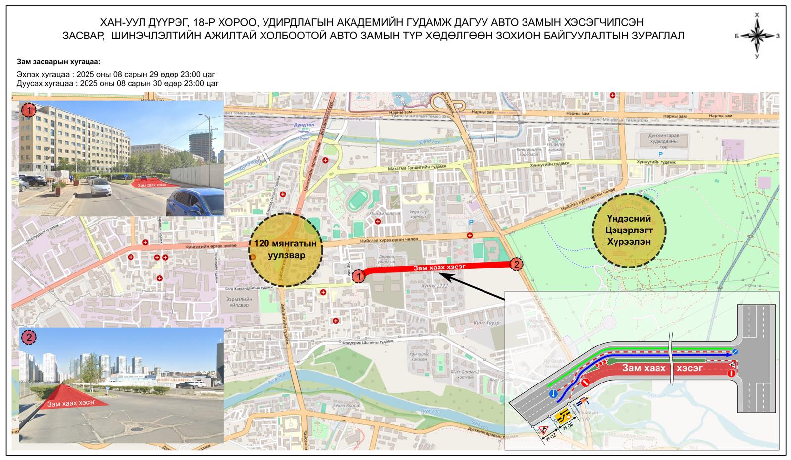 Удирдлагын академийн гудамжны засвар, шинэчлэлтийн ажлын хүрээнд Их монгол улсын гудамжнаас Оргил худалдааны төвийн уулзвар хүртэлх авто замыг хааж асфальтбетон хучилт, тэмдэглэгээний ажлыг хийж гүйцэтгэнэ.