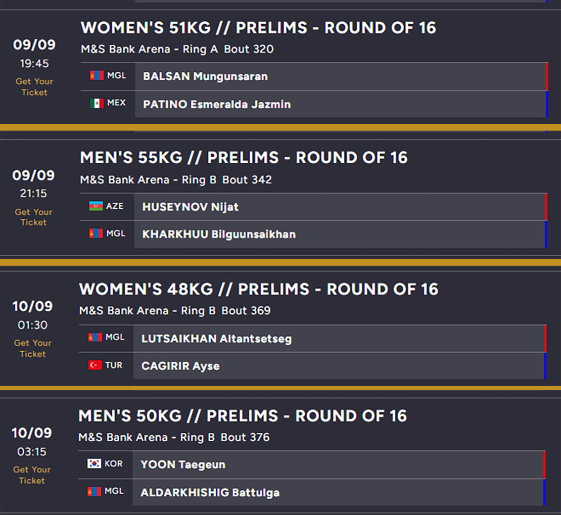 01:30-д эмэгтэйчүүдийн 48 кг-ын жинд Дэлхийн аваргын мөнгөн медальт Лутсайханы Алтанцэцэг Туркийн Айша Гагириртай, 03:15-д эрэгтэйчүүдийн 50 кг-ын жинд Алдархишигийн Баттулга Өмнөд Солонгосын Ёон Тэгүнтэй тулаан хийх болно.