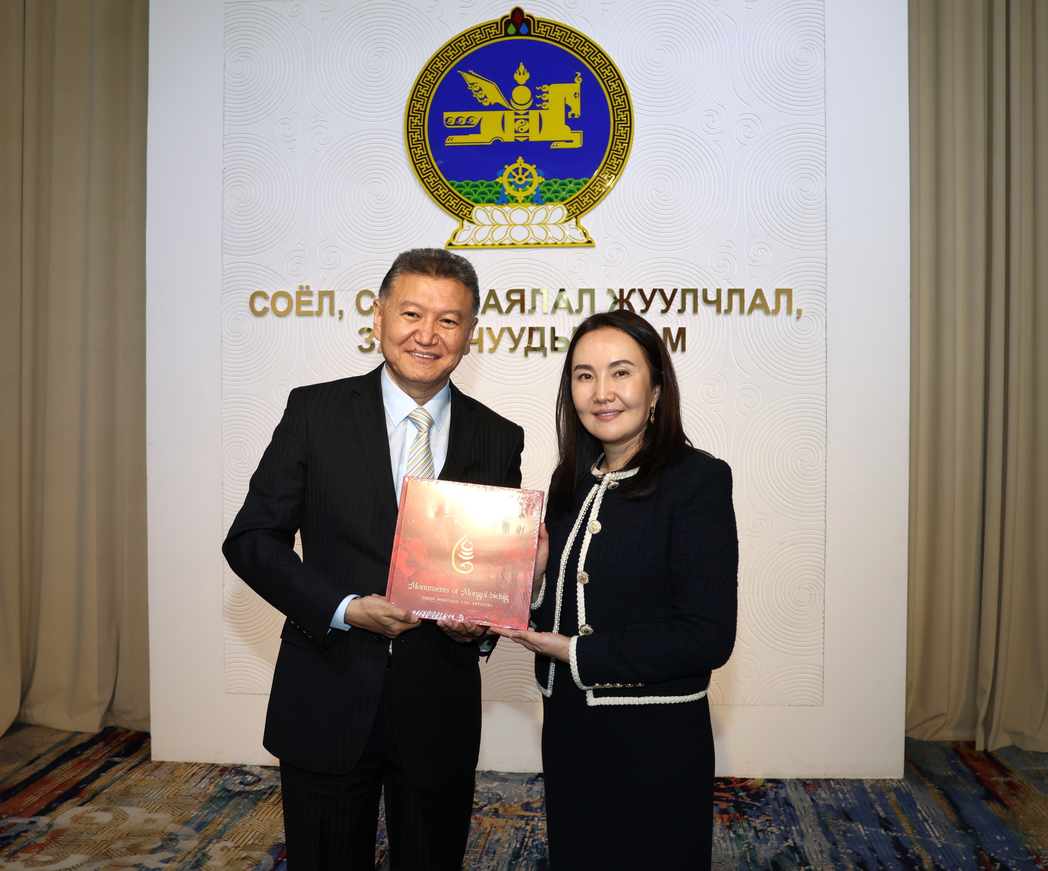 Соёл, спорт, аялал жуулчлал, залуучуудын сайд Ч.Ундрам Оросын Холбооны Улсын Бүгд Найрамдах Халимаг Улсын анхны Ерөнхийлөгч, Олон улсын шатрын холбоо (FIDE)-ны Ерөнхийлөгч асан Кирсан Николаевич Илюмжиновыг хүлээн авч уулзлаа.