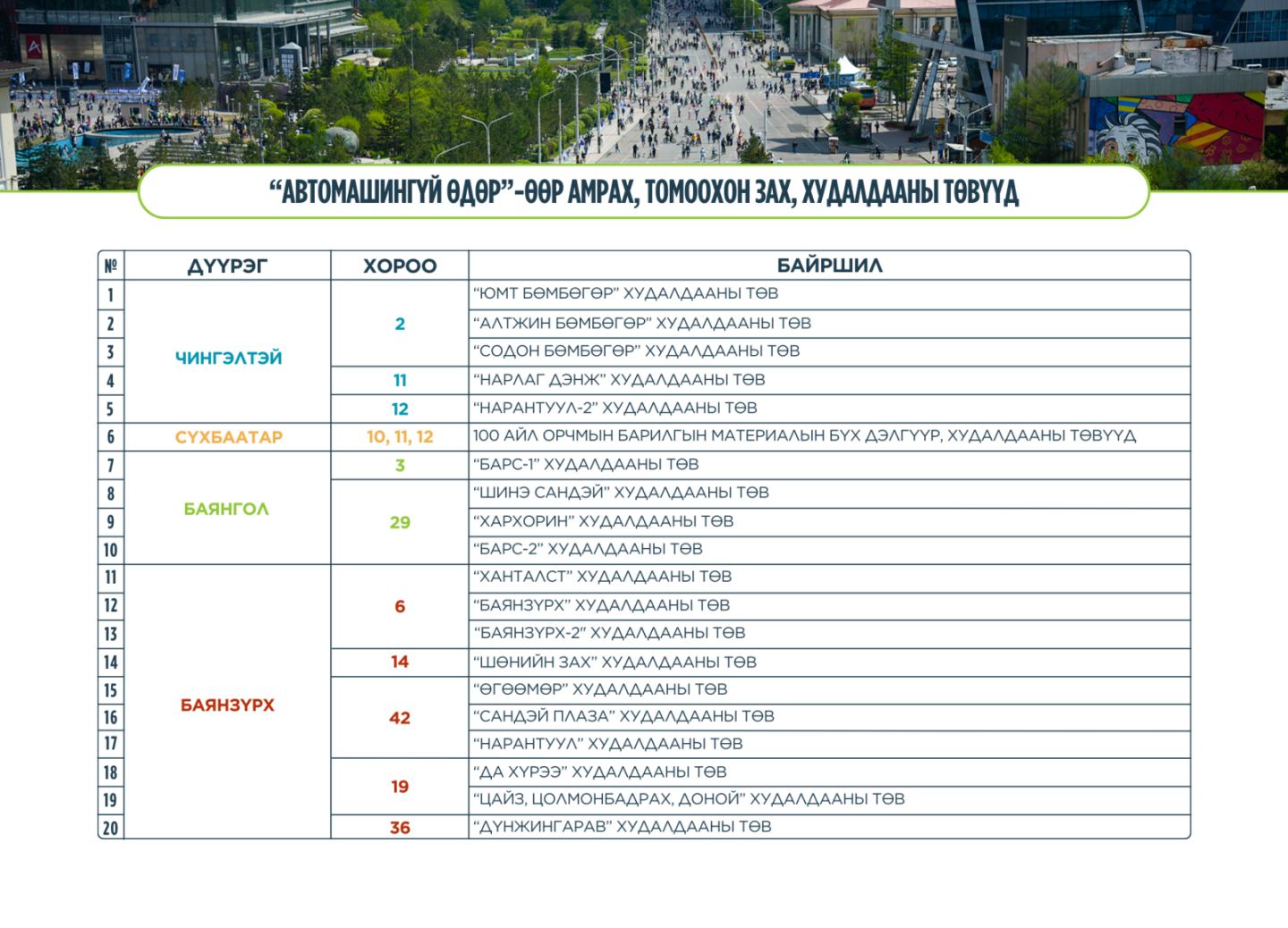 Тодруулбал: Бөмбөгөр-1, Бөмбөгөр-2, Юмт, Содон, Алтжин бөмбөгөр, Нарантуул худалдааны төв, Дүнжингарав худалдааны төв, Өгөөмөр зах, Сандэй плаза ХТ, Шөнийн зах, Баянзүрх ХТ, Баянзүрх-2 ХТ, 100 айл орчмын барилгын материалын бүх дэлгүүр, Барс-1, 2 худалдааны төв, Хархорин, Шинэ сандэй, Ханталст, Да хүрээ зах, Цайз, Цолмонбадрах, Доной модны зах, Нарлаг дэнж, Нарантуул-2 зах ажиллахгүй.