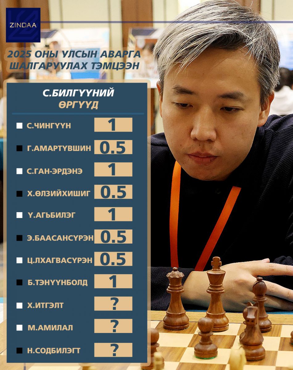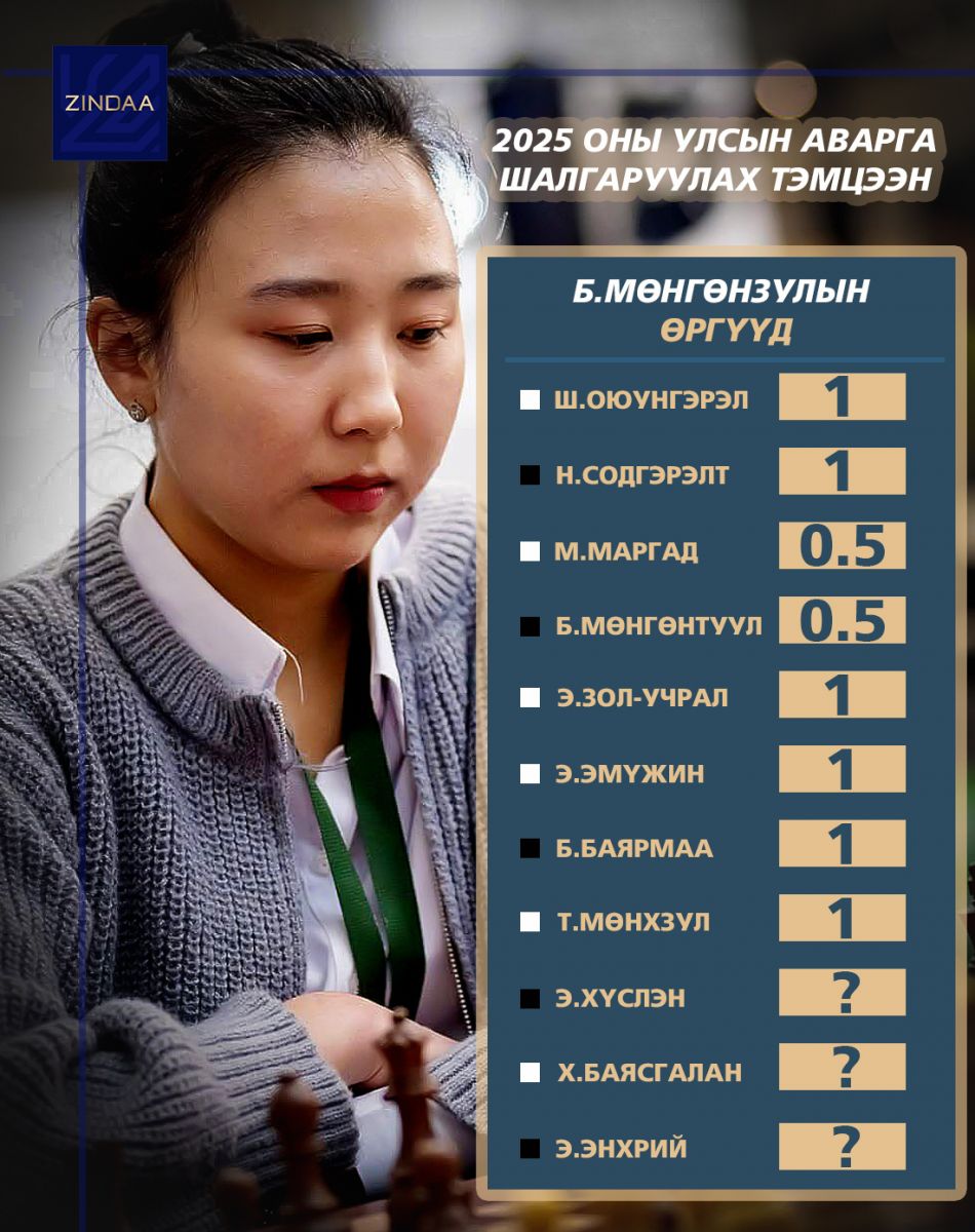 Б.Мөнгөнзул үлдсэн гурван өрөгтөө Э.Хүслэн, Х.Баясгалан, Э.Энхрий нартай тоглох болно. Энэ жил форм сайтай, өргөөс өрөгт улам чангарсаар буй Б.Мөнгөнзул энэ янзаараа үргэлжлүүлбэл улсын аварга болоход ойрхон байна.