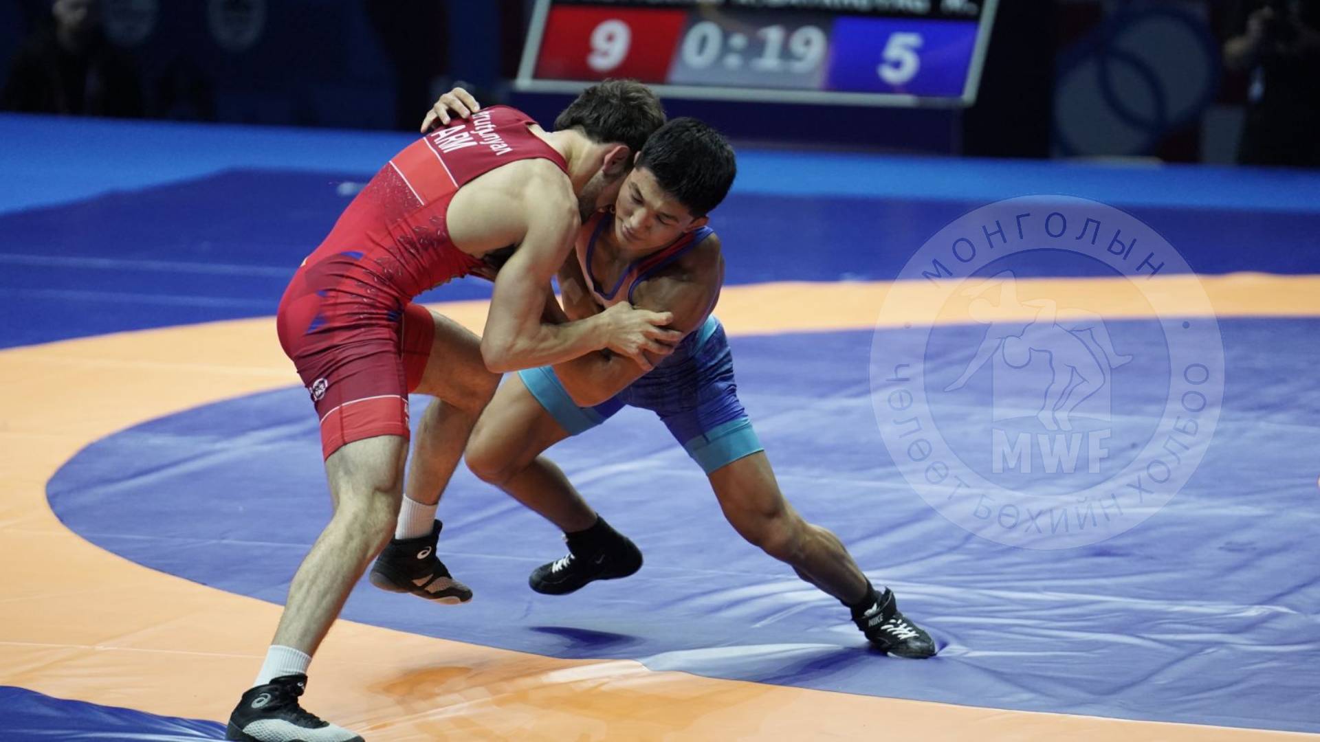 Азийн АШТ-ий хүрэл медальт Батхуягийн Мөнх-Эрдэнэ дэлхийн дэвжээн дэх эхний барилдаандаа Сербийн тамирчин, Европын АШТ-ий алт, мөнгөн медальт Азамат Тускаевийг 6:4 оноогоор буулгаж авсан ба эхний хагасыг 4:1-ээр онооны дутуу дуусгасан ч шийдвэрлэх үед 5:0-ээр илүүрхэж ялсан юм
