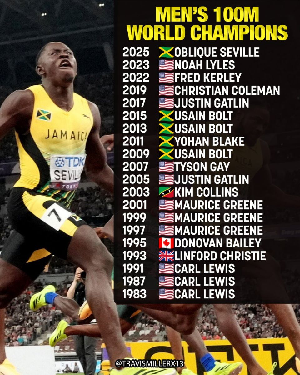 Барианы өмнөх 30-40 метрт араас нэгэн бүгдийг гүйцэн, цойлон барианд орсон нь Ямайкийн Облик Севилл байлаа. Сүүлийн хоёр ДАШТ-ий хүрэл медалиас мултарч, хоёуланд нь дөрөвдүгээр байр эзэлсэн тэрбээр Парисын олимпын наадмын хагас шигшээд хамгийн хурдан цаг үзүүлсэн ч гэлээ шөрмөсний бэртлийн улмаас финалын гүйлтэд хамгийн сүүлд орсон юм.