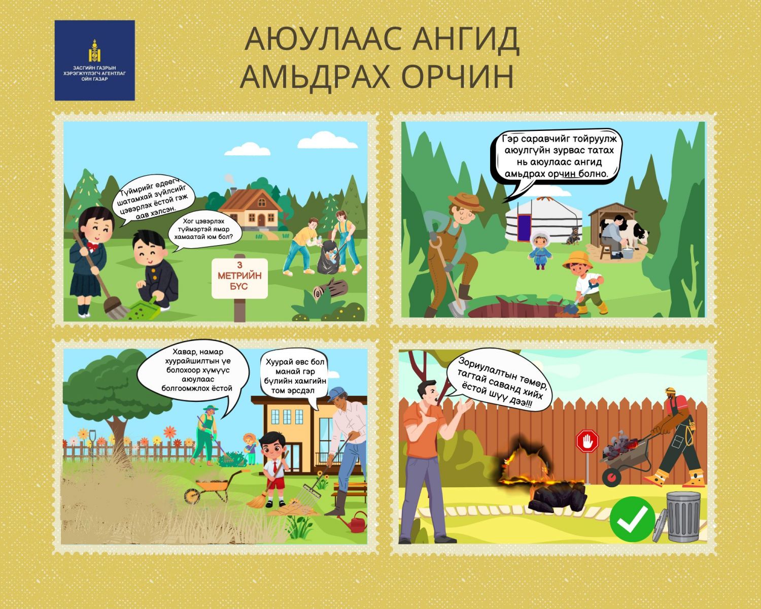 - Гэр сууц, хашаа хорооны гадуур түймрээс хамгаалах зурвас татах;