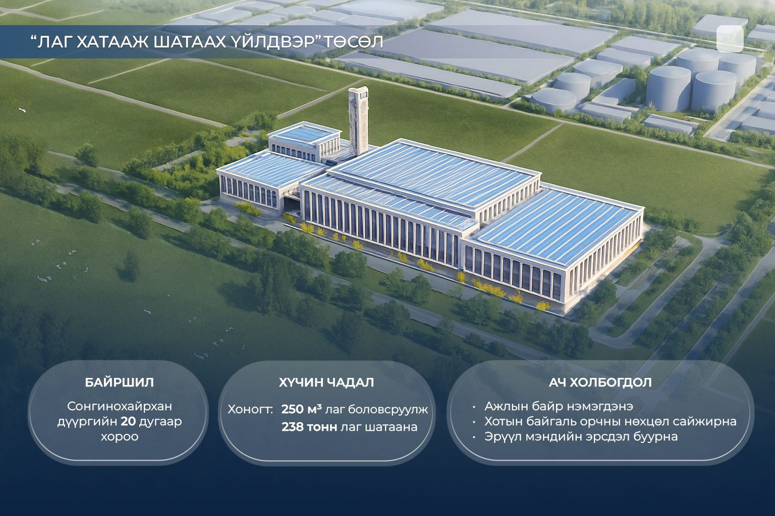 Манай улсад лаг шатаах үйлдвэр байхгүй. Тиймээс Төв цэвэрлэх байгууламжаас гарч байгаа лагийг боловсруулж, хатааж, шатаах технологиор устгаж, эрчим хүч үйлдвэрлэх төслийг хэрэгжүүлэхээр Улаанбаатар хотыг хөгжүүлэх 24 мега төсөлд тусгасан. Үйлдвэрийн барилга угсралтын ажлыг 2026 онд эхлүүлнэ. Өнөөдрийн байдлаар төслийн ТЭЗҮ-ийг боловсруулж, Барилгын хөгжлийн төвөөр магадлуулсан. Барилга угсралтын тендерийг зарлахаар бэлтгэл хангаж байгаа юм. Уг үйлдвэрийг төр, хувийн хэвшлийн түншлэлээр Сонгинохайрхан дүүргийн 20 дугаар хороонд буюу Улаанбаатар хотын бохир ус цэвэрлэх байгууламжийн урд талын 40 мянган ам.метр талбайд барина. Үйлдвэр олон улсын стандартад нийцсэн, байгаль орчинд ээлтэй технологийг ашиглан хоногт дунджаар 250 метр.куб лаг боловсруулж, 238 тонн лаг шатаах хүчин чадалтай. Харин жилд 843.200 метр.куб лагийг дахин боловсруулж, шатаалтын явцад гарсан утаа, хий зэргийг өндөр технологийн агаар цэвэршүүлэх системээр шүүх юм.
