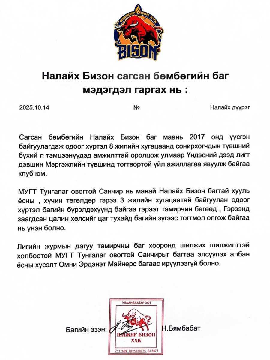 Сагсан бөмбөгийн хүрээлэлд “Т.Санчир талбайд эргэн ирэх үү?”, “Налайх Бизон хариуцлага хүлээх үү?” гэх асуултууд хөвөрч буй энэ үед, холбоо болон багууд гэрээний ил тод байдал, тамирчны эрхийг хамгаалах бодит алхам хийх цаг иржээ.