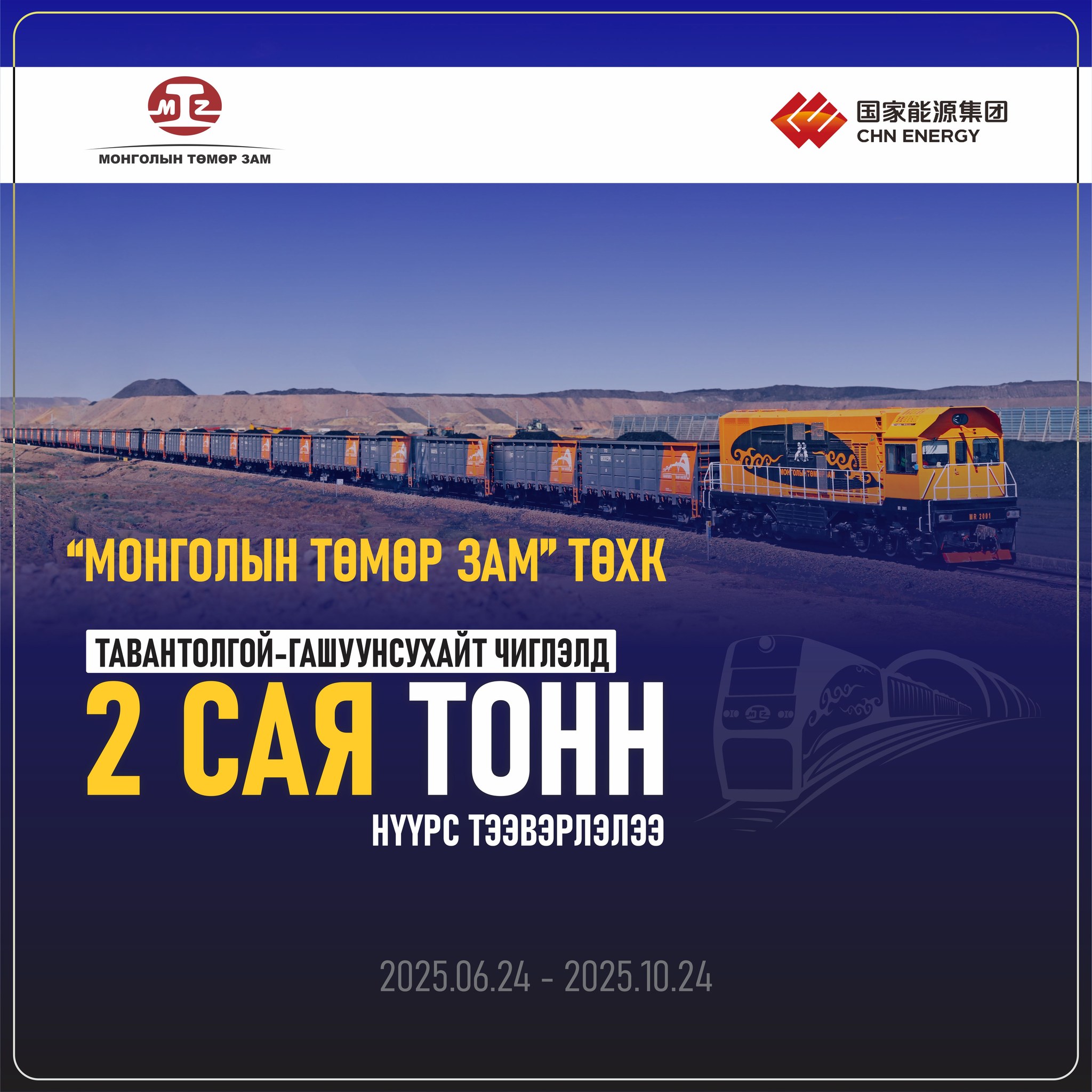 “Монголын төмөр зам” ТӨХК, “Чайна энержи коксжих нүүрс (Тяньжин)” ХХК-тай хийсэн нүүрс тээвэрлэлтийн урт хугацааны гэрээний дагуу 2025 оны 06 дугаар сарын 24-ний өдөр тээвэрлэлтийг эхлүүлж, өнөөдрийг хүртэл нийт 2,000,000 тонн нүүрс тээвэрлэлээ.