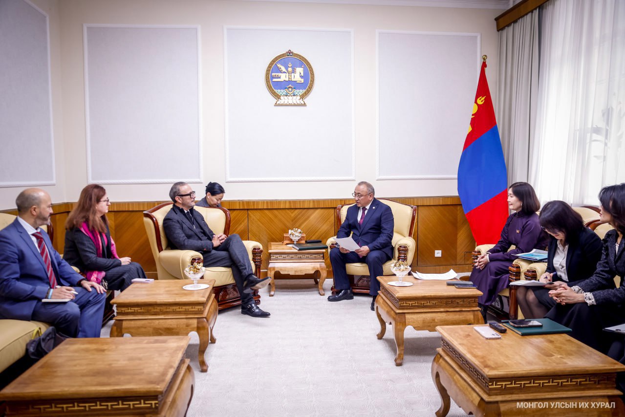 Улсын Их Хурлын гишүүн, Байгаль орчин, хүнс, хөдөө аж ахуйн байнгын хорооны дарга Б.Бейсен, Улсын Их Хурлын гишүүн Б.Мөнхбаясгалан нар өнөөдөр /2025.10.30/ Цөлжилттэй тэмцэх тухай Нэгдсэн Үндэстний Байгууллага /НҮБ/-ын конвенцын Нарийн бичгийн газрын Тамгын газрын дарга Ражеб Булхаруф тэргүүтэй төлөөлөгчдийг хүлээн авч уулзлаа.